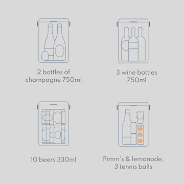 The Fieldbar Drinks Box is designed to hold two bottles of Champagne or three bottles of still wine in an upright position, making it an essential companion for stylish outdoor occasions.