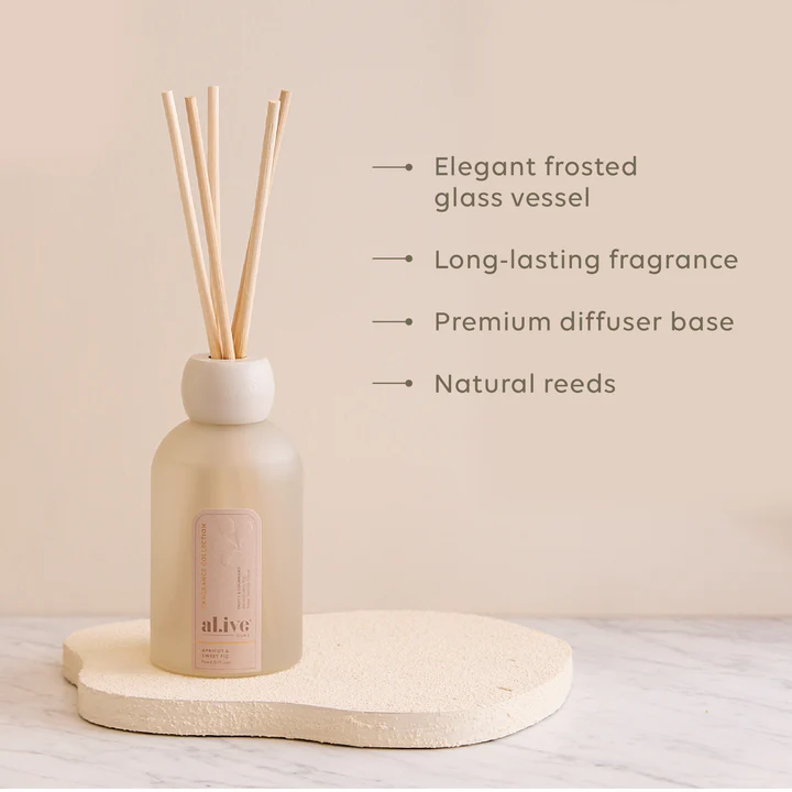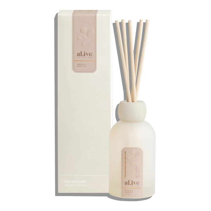 Embrace the warmth of the exclusive al.ive body Apricot & Sweet Fig Reed Diffuser. This premium formula continuously releases the sophisticated blend of ripe apricot and earthy fig, creating an inviting atmosphere that feels both familiar and intriguing. Housed in a frosted glass vessel, it brings cosy elegance to any space while delivering months of beautiful, evolving fragrance.