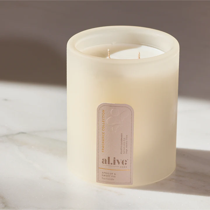 Discover a new signature scent with the alive body Apricot & Sweet Fig Soy Candle. This warm, sophisticated fragrance blends the lusciousness of ripe apricot with the earthy sweetness of fig, creating an inviting atmosphere that feels both familiar and intriguing. Hand-poured with our premium soy wax blend, it delivers up to 70 hours of beautiful scent while adding sculptural elegance to your space in an elegant frosted glass vessel.