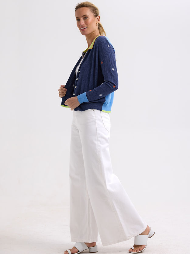 The Blossoms Handwork Cardigan by Zaket & Plover is a standout piece that combines artistry with comfort. Featuring bold colour blocking and delicate hand-embroidered blossoms across the body and sleeve, it’s finished with charming blanket stitching along the collar for an extra touch of detail. With a relaxed, slightly tailored fit and soft ribbed trims, this cardigan blends warmth, whimsy, and everyday elegance effortlessly.