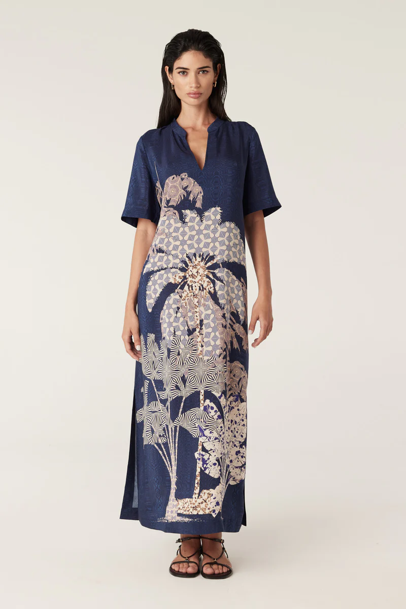The Pina Kaftan Dress from Cable Melbourne features a relaxed fit with a stand collar and side splits. Made from a lightweight and breathable silk blend with an exclusive print. This kaftan includes a removable waist tie with tassel detail for versatile styling.