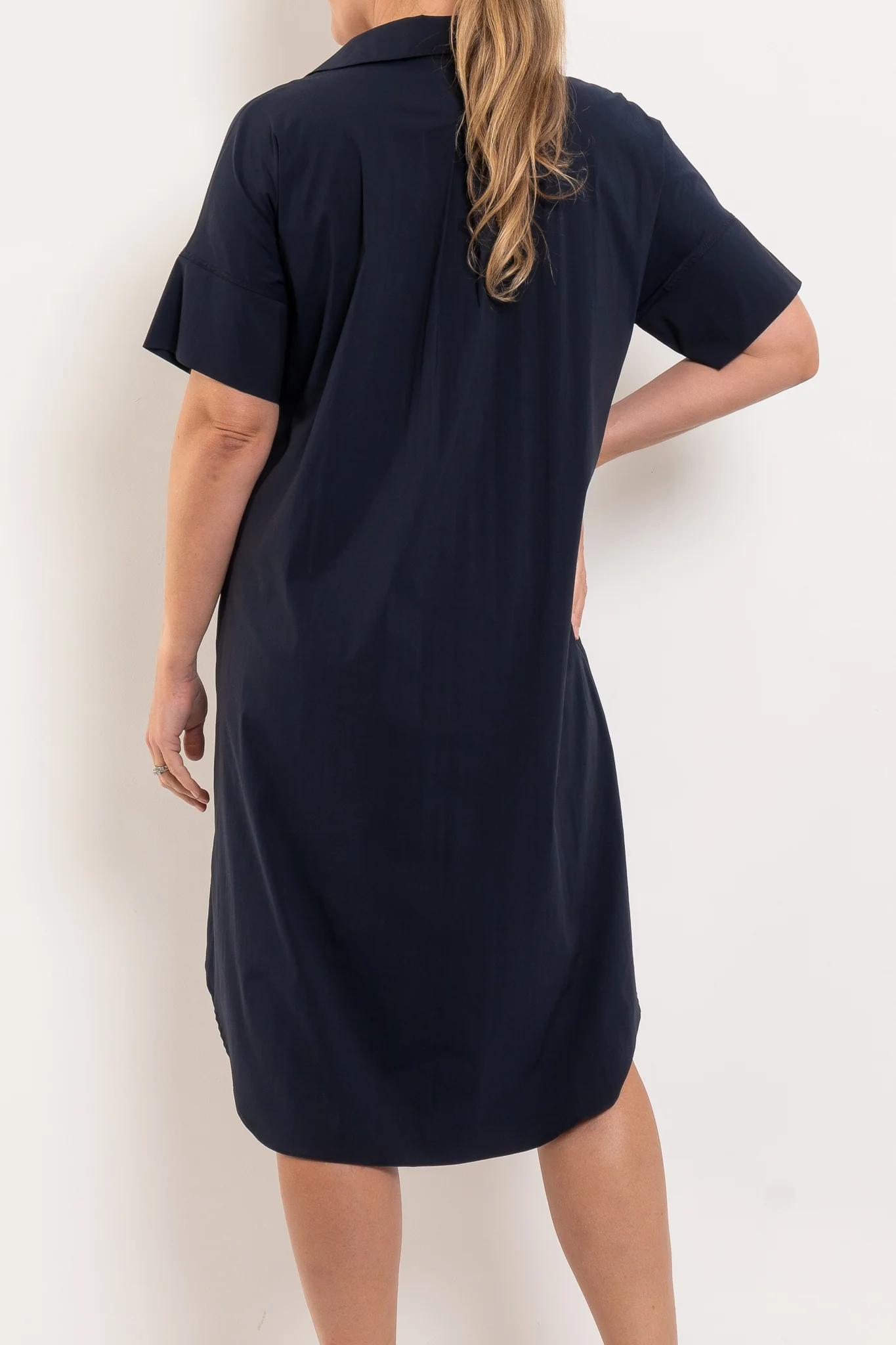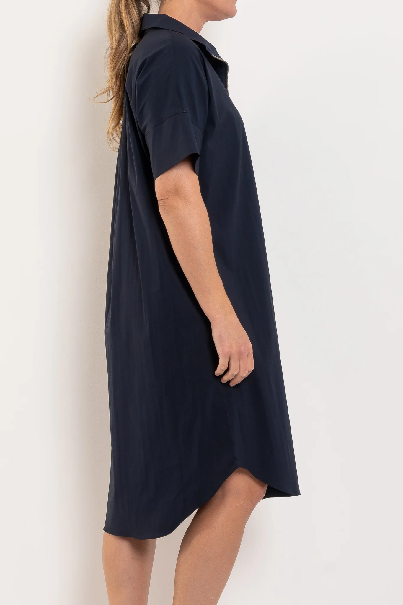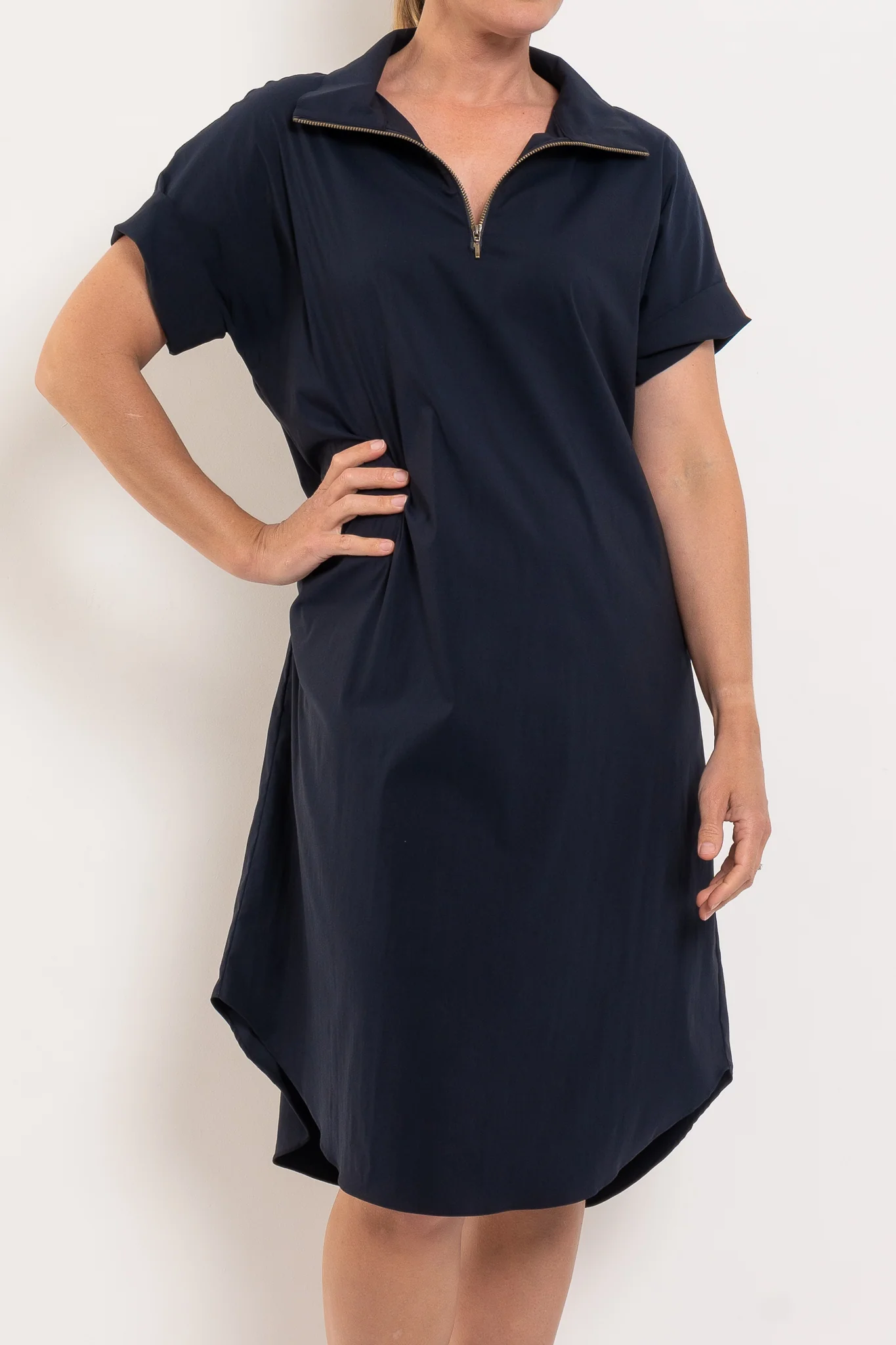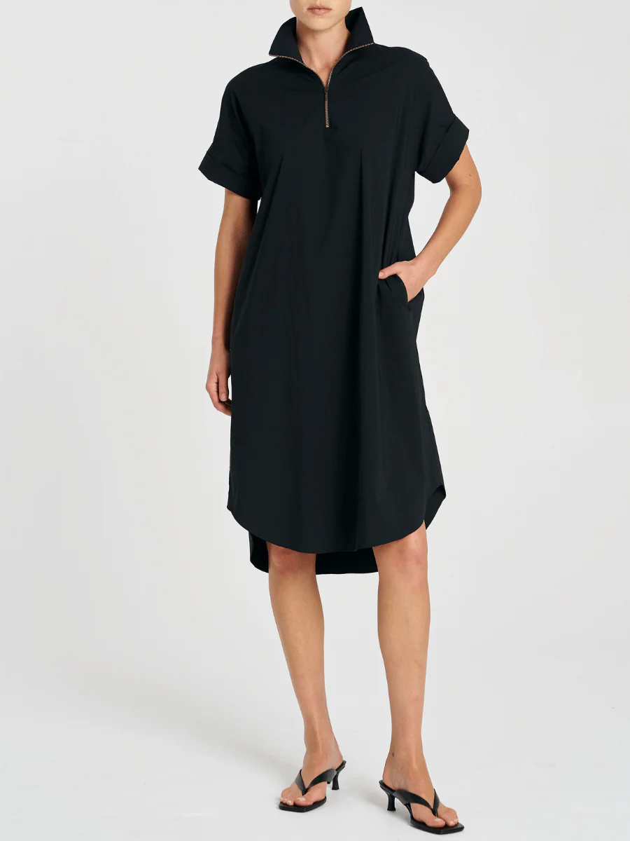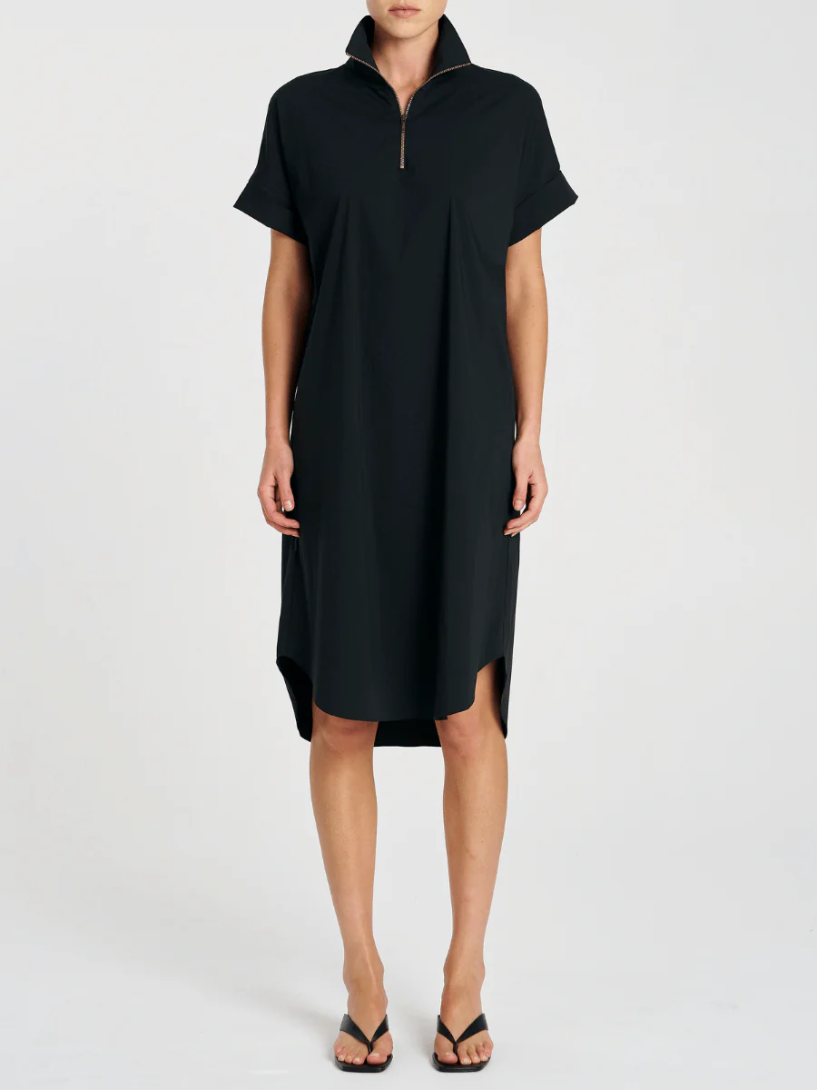 This short-sleeve relaxed fit Mela Purdie dress is designed with a zip-through stand collar and curved hemline for a polished, modern silhouette. Crafted in Australia from lightweight Microprene, the Mela Purdie Half Zip Dress is cut to a relaxed mid-length silhouette with short sleeves and a gently curved hemline for ease of movement.