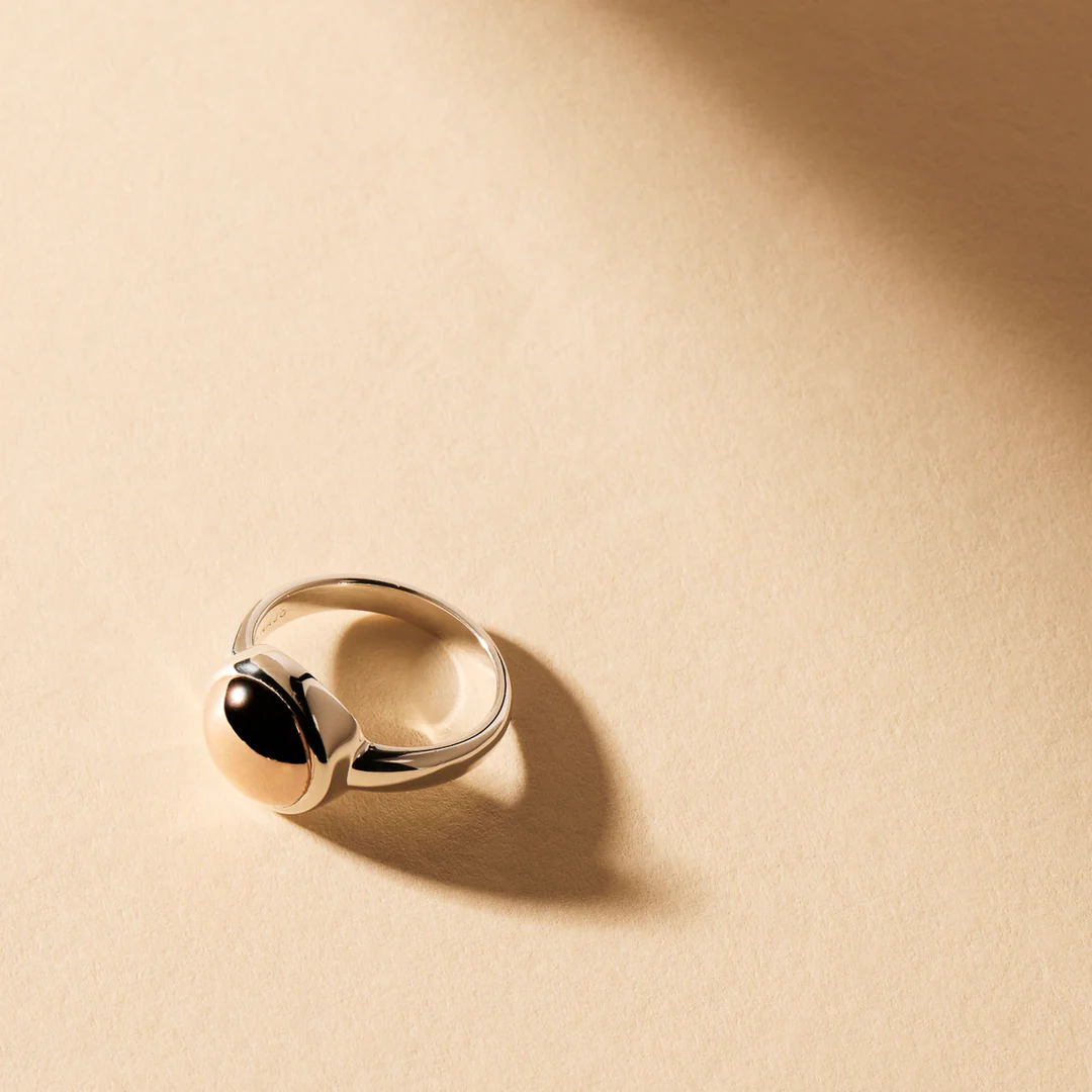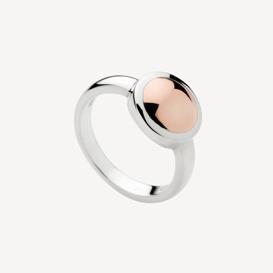 Expertly crafted in sterling silver, it features a polished rose gold inlaid disc that adds a touch of radiant sophistication. Perfect for making a confident style statement, this versatile ring brings effortless glamour to any outfit.