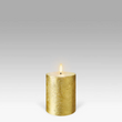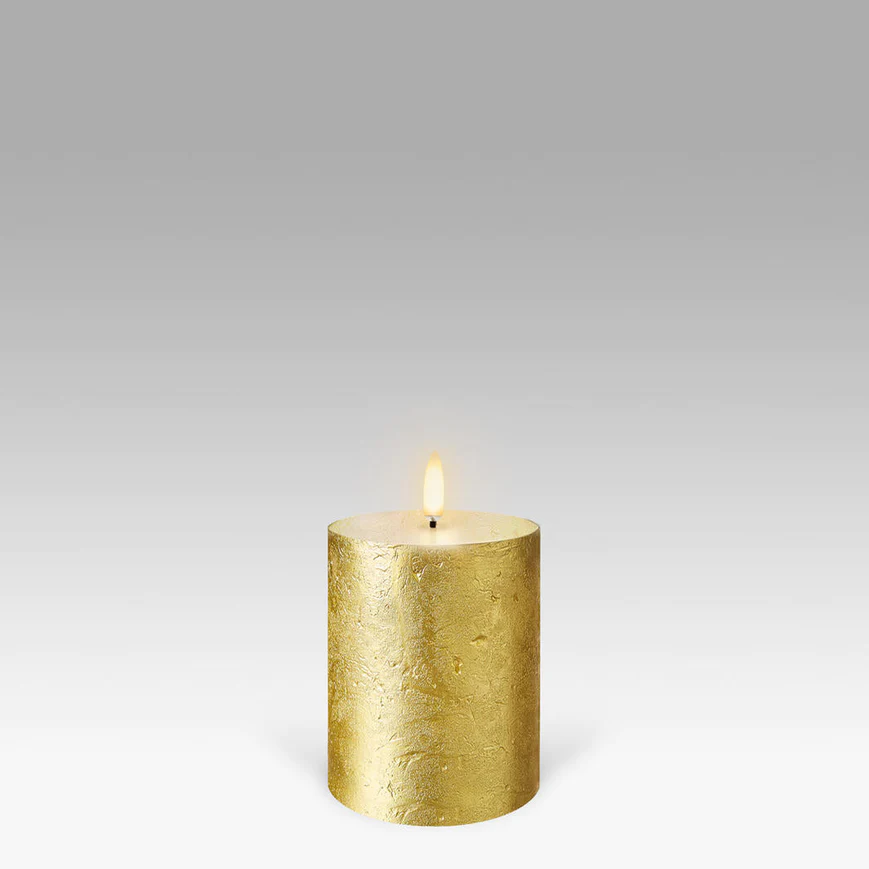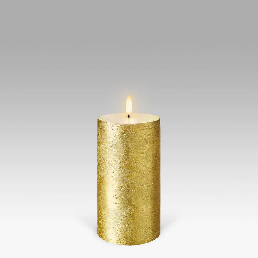 The pillar candle in textured metallic gold by Uyuni reflects a sophisticated yet casual lifestyle, and will add visual interest without dominating the room.