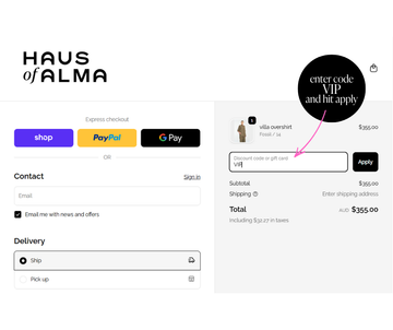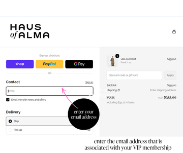 The Haus of Alma VIP Program gives you exclusive access to 10% off all full-priced items for eligible VIPs.