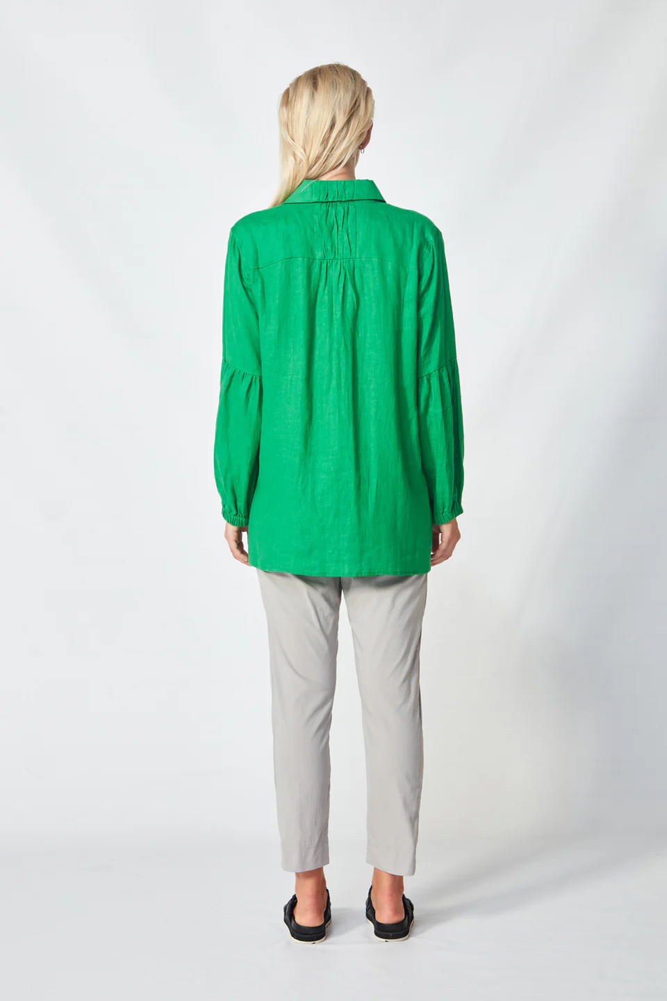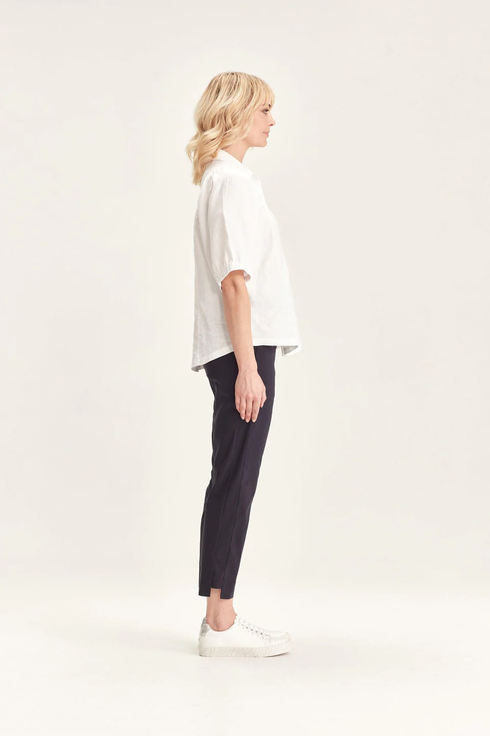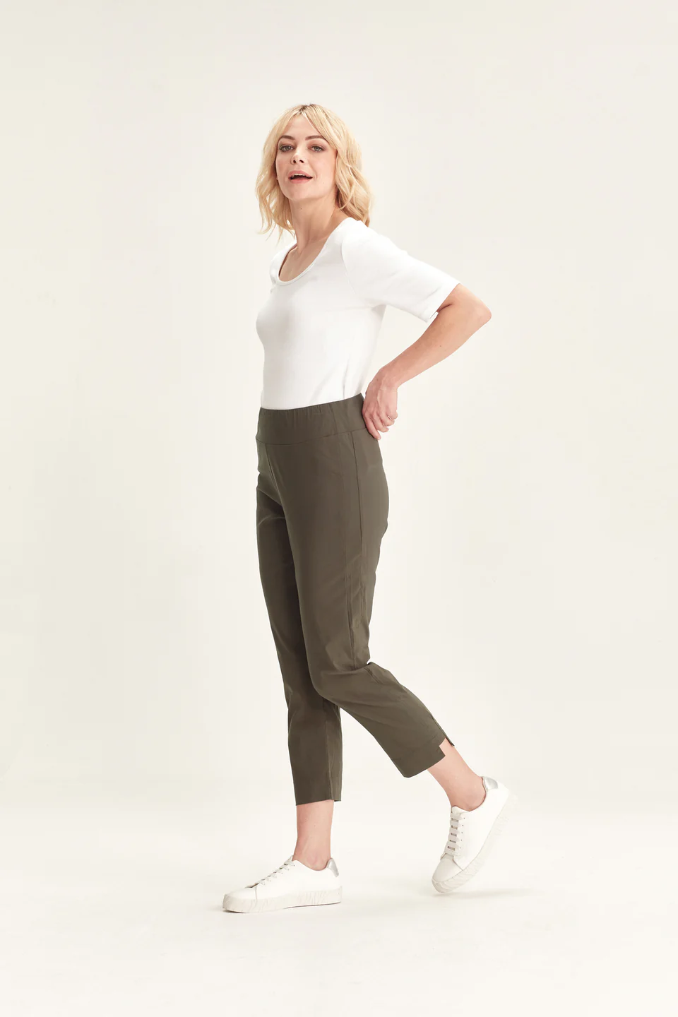 Crafted from VERGE's exclusive European lightweight stretch Cotton Acrobat fabric, the 7/8 length slim leg Desiree Pant offers exceptional comfort, breathability, and easy care. This stylish pant features a stepped hem, panel detailing down the sides, and a concealed elasticized waistband for a sleek, comfortable fit.