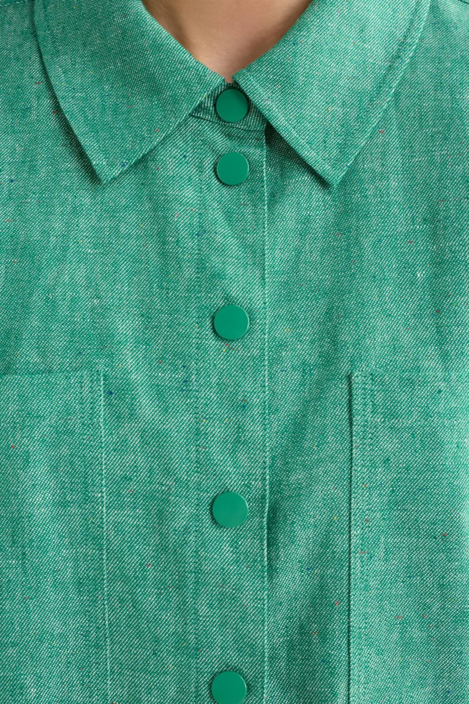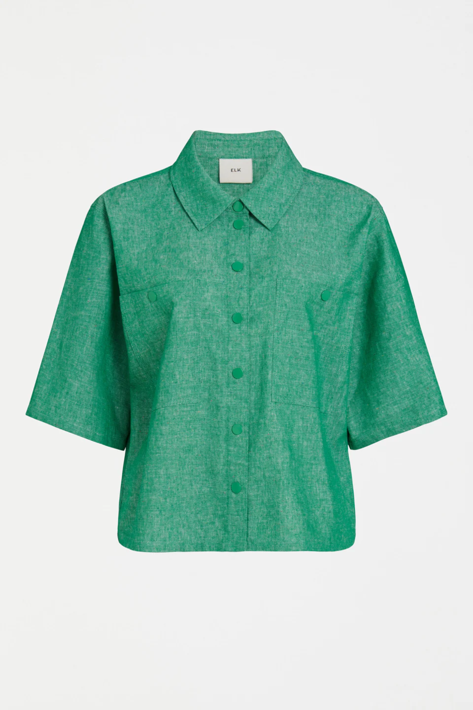 The ELK Alpah Shirt in Green Speckle is a relaxed, utility-inspired piece crafted from a textured speckled linen-cotton blend. This button-through style features metal snap closures, a structured collar with stand, and two front chest patch pockets for a practical touch.