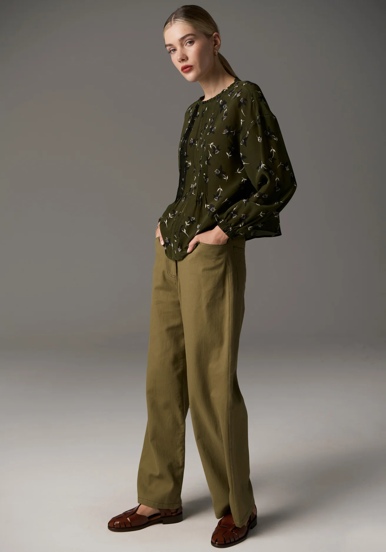 The Budlia Pintuck Top from POL Clothing combines pure silk with an exclusive print for a truly feminine touch. In a Khaki hue, this top features a round neckline with delicate frill detailing, complemented by a keyhole button fastening at the centre back. Pintuck and pointelle detailing along the front adds texture and interest, while the dropped armholes and pointelle shoulder accents elevate the design. The bracelet-length sleeves with elasticised cuffs complete the look, making this a beautifully versatile piece.