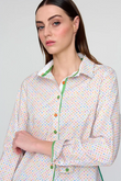 The Tinta Cenon Shirt is crafted from soft cotton poplin and features a vibrant floral geometric print. Designed with a straight cut, it includes a classic shirt collar and a front closure with colourful buttons. The long sleeves are finished with cuffs and a two-button closure, complemented by a green ribbon detail. A back pleat and slightly rounded hem add the finishing touches to this stylish and versatile piece.