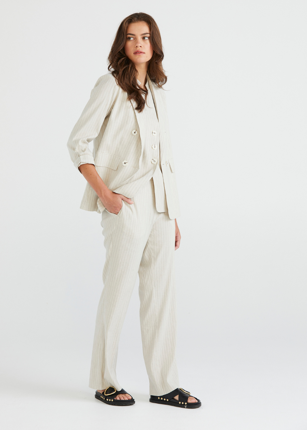 Elevate your style with the Chelsea Pant in Natural from Lania The Label, crafted from a luxurious linen-blend in a refined pinstripe. The wide-leg silhouette brings a contemporary edge to classic tailoring, while the pull-on design and elasticated back waistband ensure comfort. Pair with the Chelsea Jacket for a chic, on-trend suited look that’s sure to make a statement.