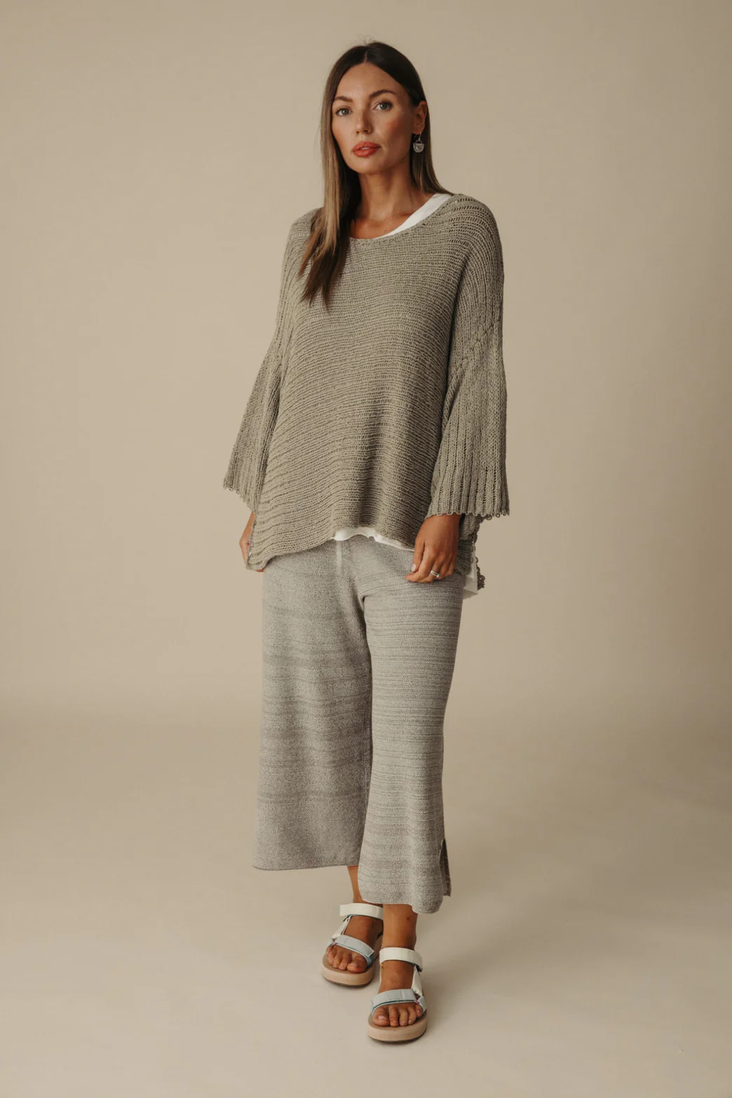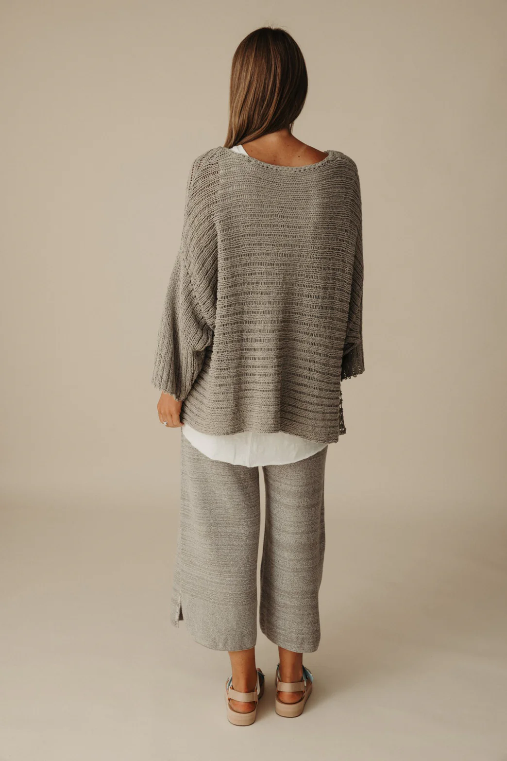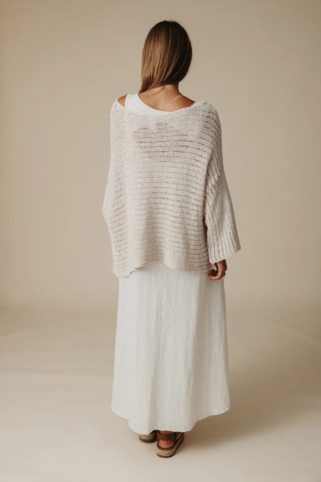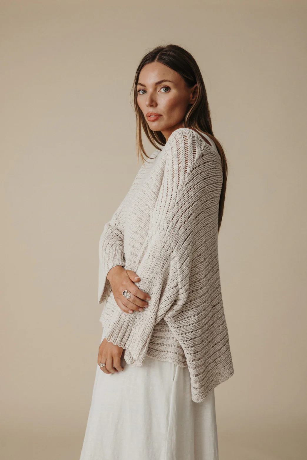 The Talamaya Coast-to-Coast pullover is crafted using a delicate drop needle technique, resulting in a timeless design that’s as intricate as it is elegant. Featuring a simple, squared silhouette, this piece drapes effortlessly, especially when styled off one shoulder. Its relaxed sleeves add to the laid-back charm, making it a versatile wardrobe staple.
