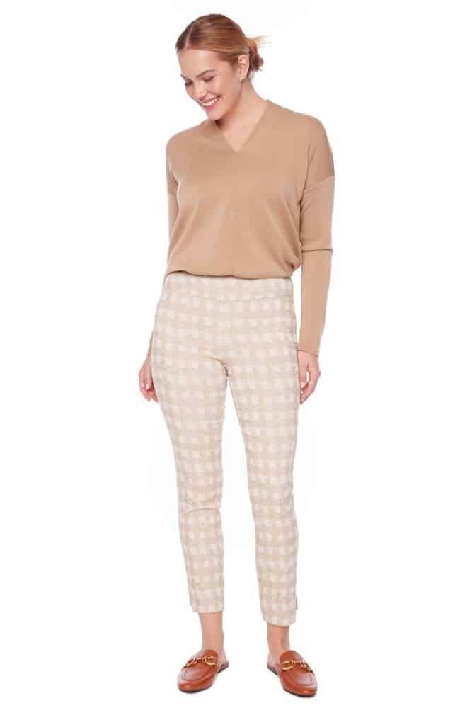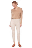 A modern twist on preppy sophistication, the UP Pants Ecru Plaid Techno Ankle Pant redefines classic style with fresh, airy hues. Subtle gold rivets add a contemporary edge, striking the perfect balance between timeless elegance and on-trend appeal. Pair with tan loafers and a crisp shirt for a polished look, or switch to sneakers and a feminine blouse for a playful contrast.