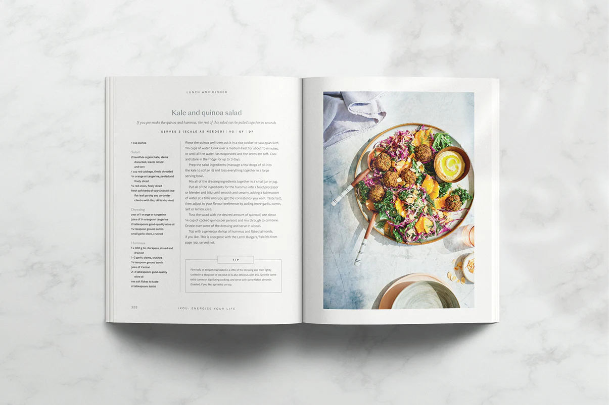 This beautifully presented and inspiring 344 page book is three-part: 1st part- biography/ story, 2nd part -wellness, 3rd part- recipes/ meal planning (each recipe has a colour photo)