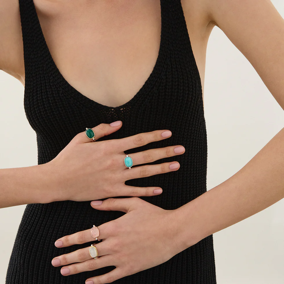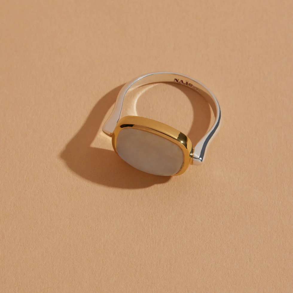 Inspired by Paris in bloom, the effortlessly glamorous Fleur Ring from NAJO channels the soft light and fluid beauty of springtime Impressionist watercolours. Her impeccably crafted design is defined by the most beautiful rectangular rainbow moonstone cabochon gemstone in a yellow-gold-plated bezel. On her sculptural sterling silver band, this stone of protection emits a magical iridescent light.