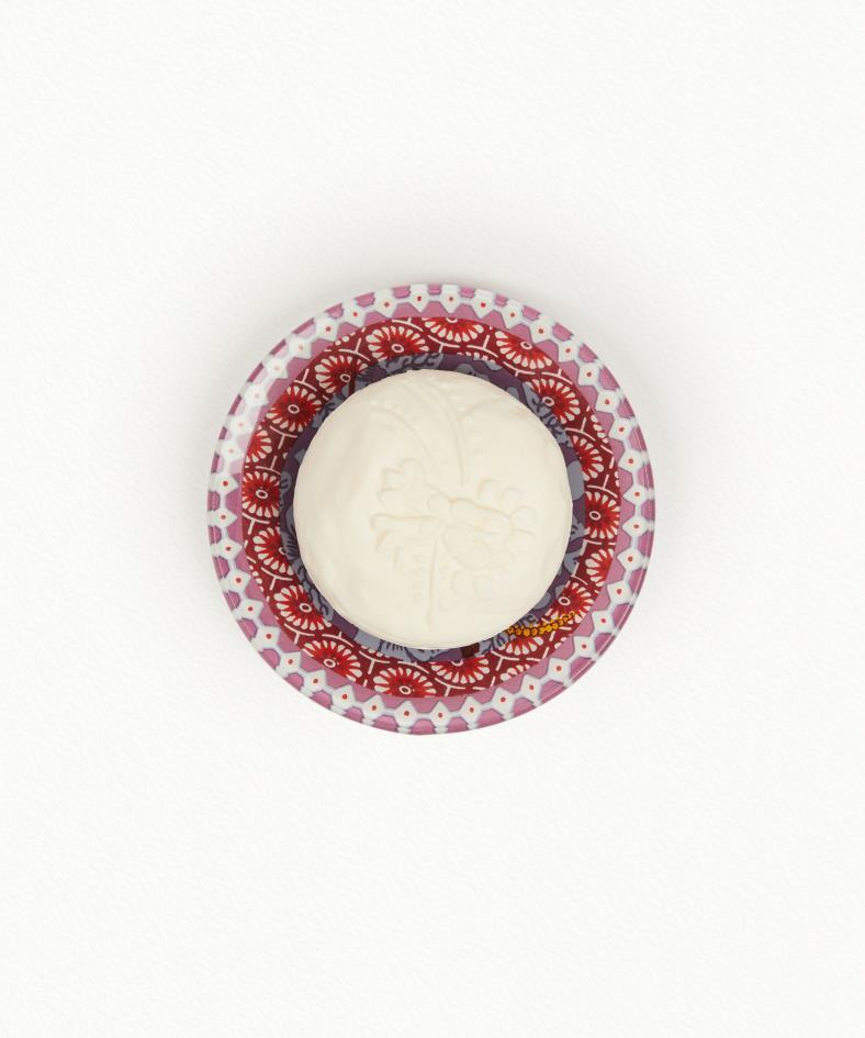 Grenade - Pivoine (Pomegranate - Peony). The iconic engraving on this soap and this soapdish release the delicious pomegranate fragrance that it represents, blended with a heart of peony and rose absolute on woody base notes of cedar and oak.