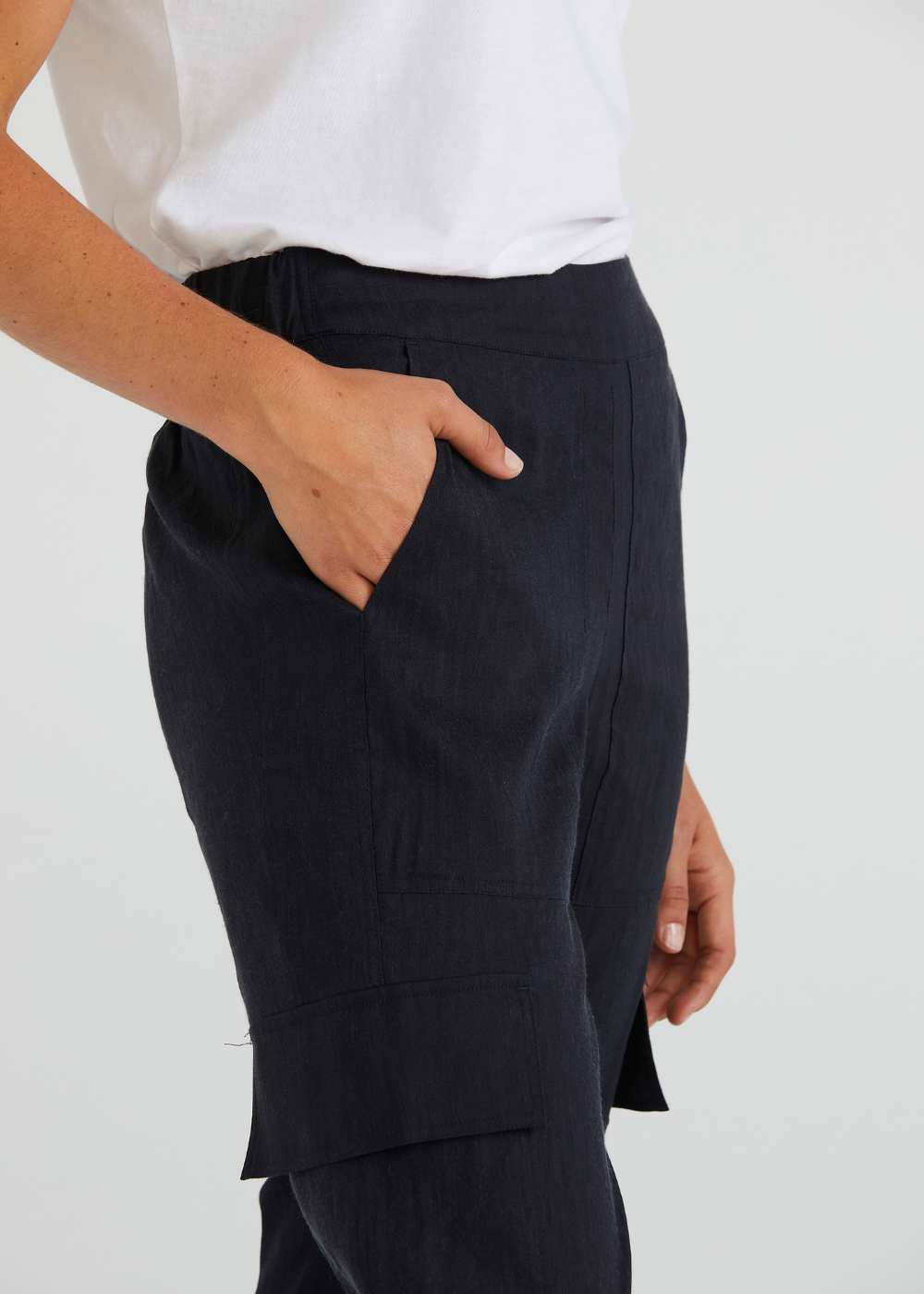 Embrace effortless style with the Harrington Pant in Ink from Lania The Label, made from a breathable linen blend. Featuring a pull-on design, these pants offer a smooth front with a faux fly and an elasticated back waist for ultimate comfort. The modern patch pocket detailing adds a contemporary edge to this versatile staple.