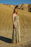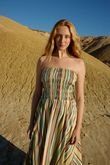 The Aston Studio Layla Dress Meadow Stripe features a shirred bodice and full skirt offering a form fitting silhouette and a flowing body for effortless movement. This cotton dress is perfect for daytime events, garden parties, or casual chic styling.