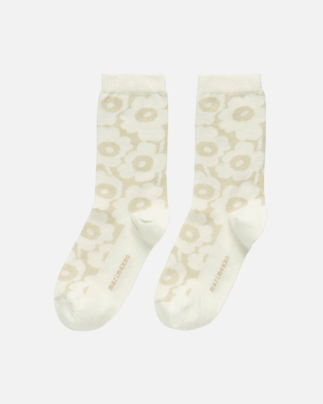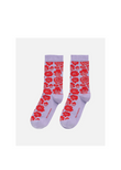The Marimkekko Linjaus ankle socks are made of a cotton blend, and they feature the Pioni pattern.