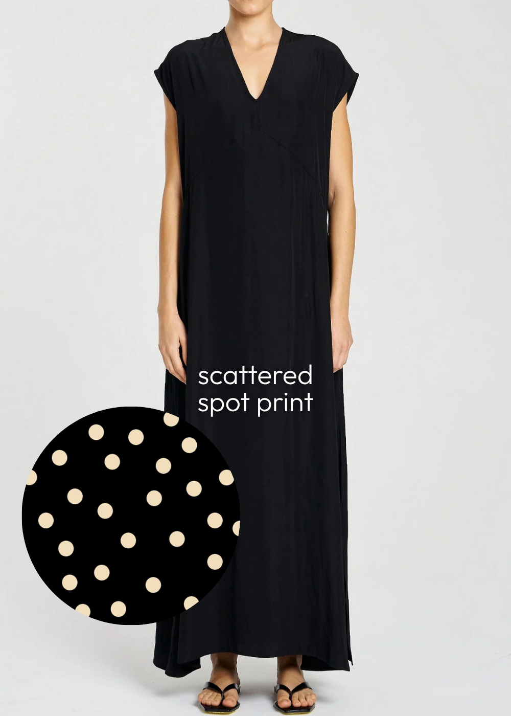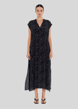 Crafted in Mela Purdie's mid-weight, soft washed Silk Crepe De Chine, featuring the bold Scattered Spot Print. The 'Maxi Slice Dress in Silk Scattered Spot Print' from Mela Purdie features a V neckline and maxi length. A flattering silhouette that can take you from day to night