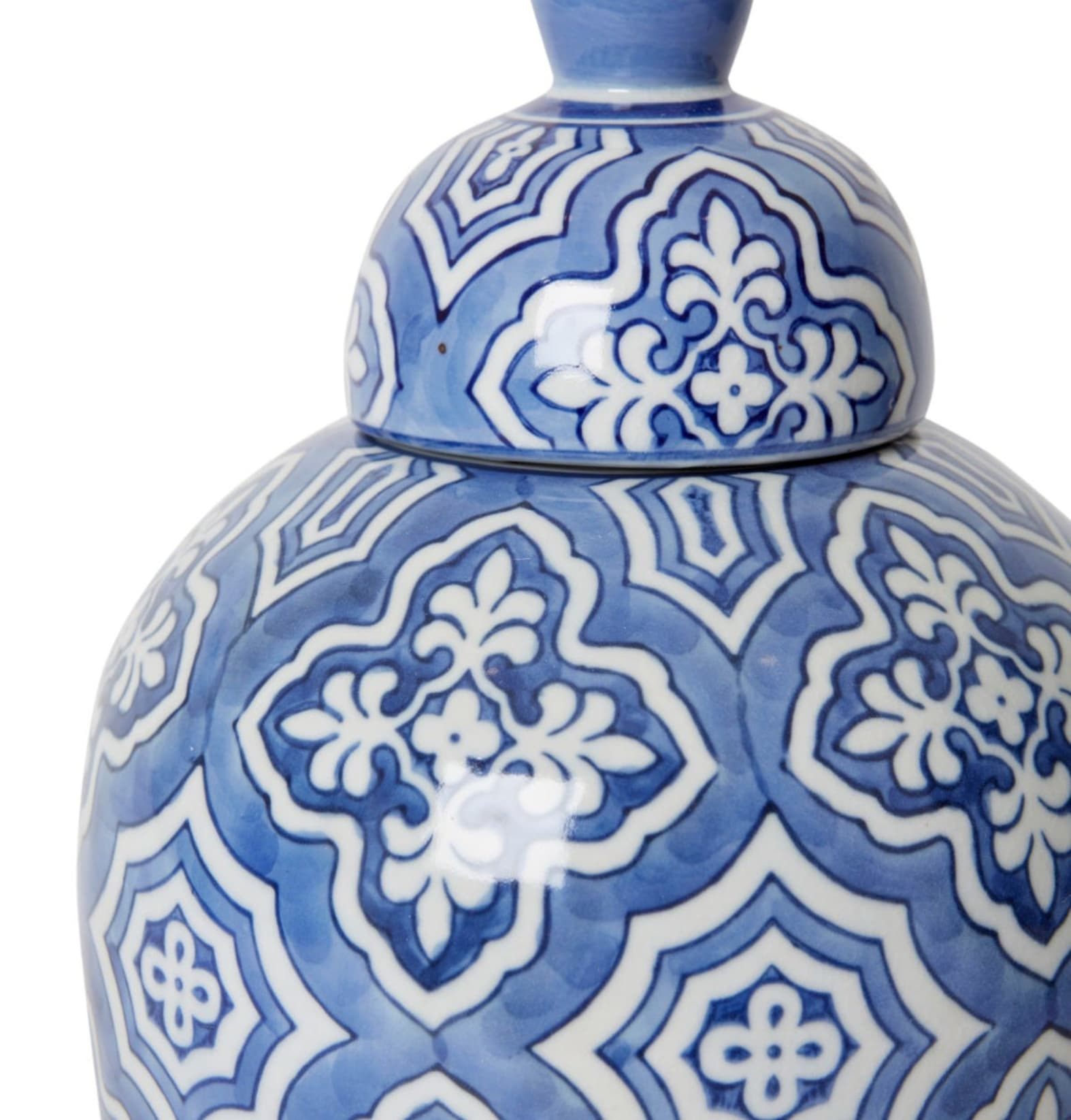 The Elme Munni Ginger Jar is a timeless decorative piece, featuring an elegant blue and cream chinoiserie pattern on fine porcelain.