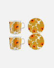The Marimekko Unikko pattern Oiva breakfast set includes two 4 dl mugs and two 20 cm plates. The set is dishwasher, oven, microwave, and freezer safe.