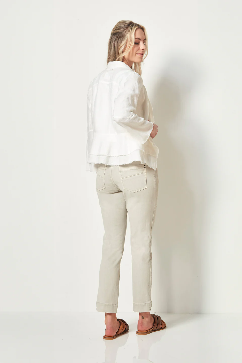The Verge Proof Jacket is a 100% linen piece featuring a chic shawl collar and a flattering, fitted waist with a double peplum detail. Its bracelet-length sleeves flare elegantly from the elbow, adding a touch of sophistication. Designed to fall at the hip, this jacket offers a refined yet versatile style for any occasion.