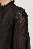 Embrace timeless elegance with the Once Was Sevilla Cotton Silk Shirt in Onyx—a refined blend of delicate detailing and romantic design. Crafted from a sheer cotton-silk blend, this blouse feels featherlight and luxuriously soft. Intricate lace embroidery graces the sleeves, lending a graceful, feminine edge, while a softly ruffled high neckline evokes vintage charm with modern appeal.