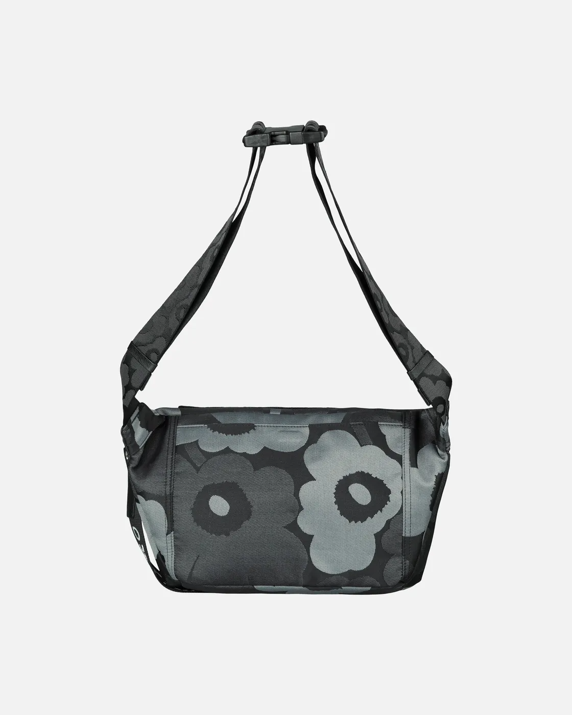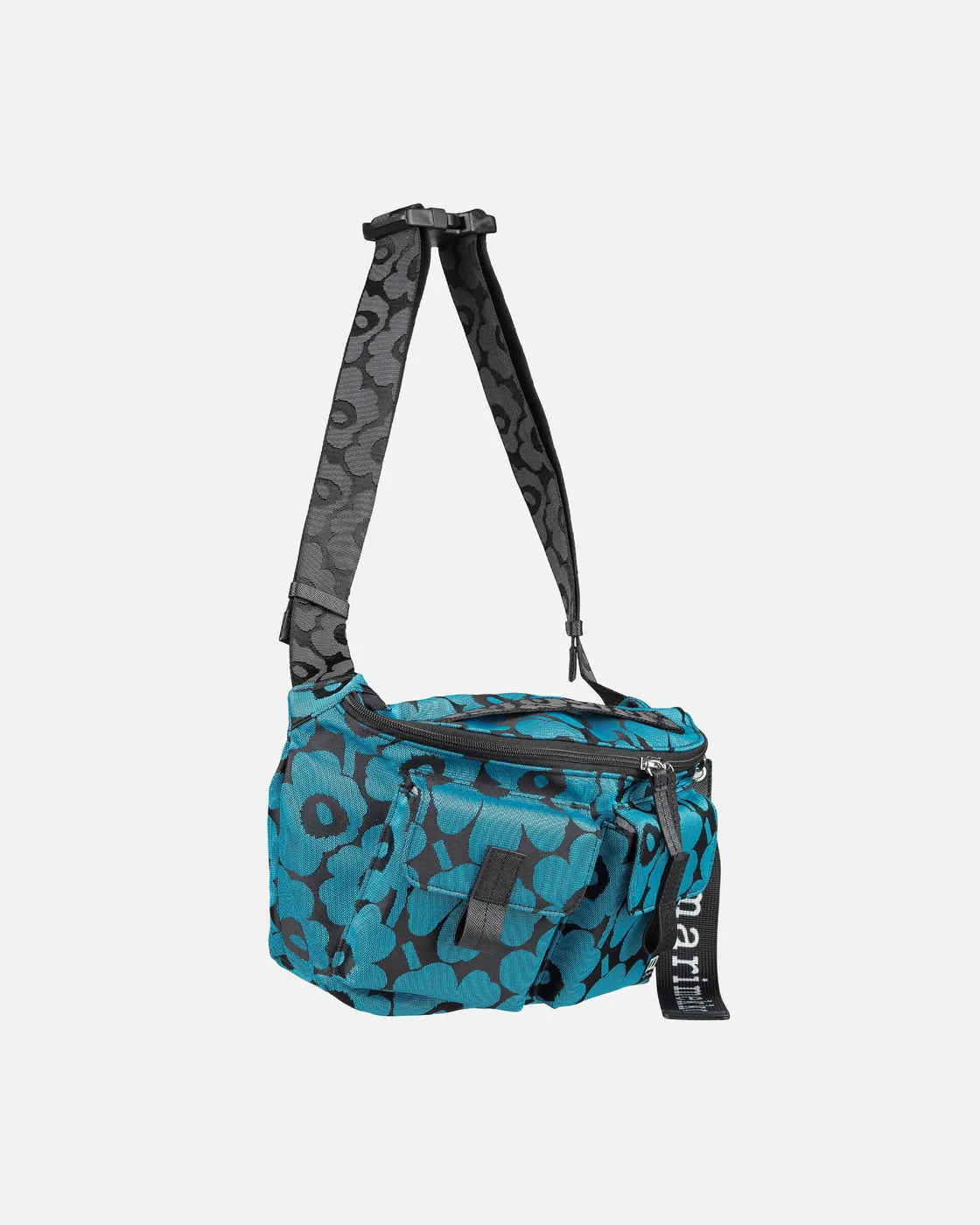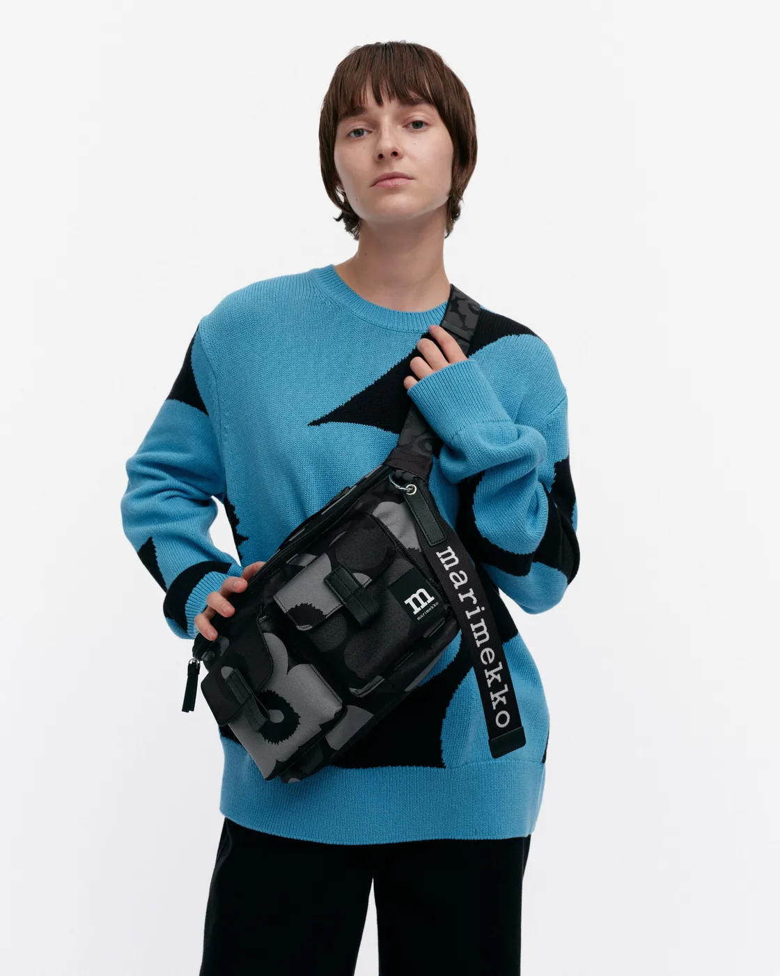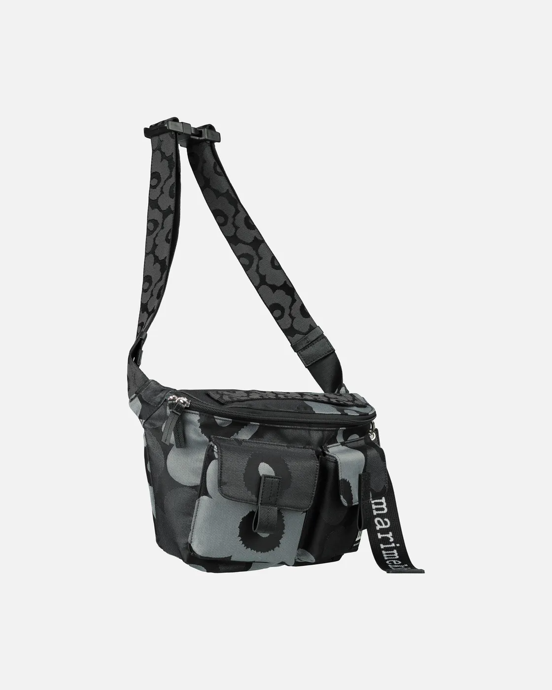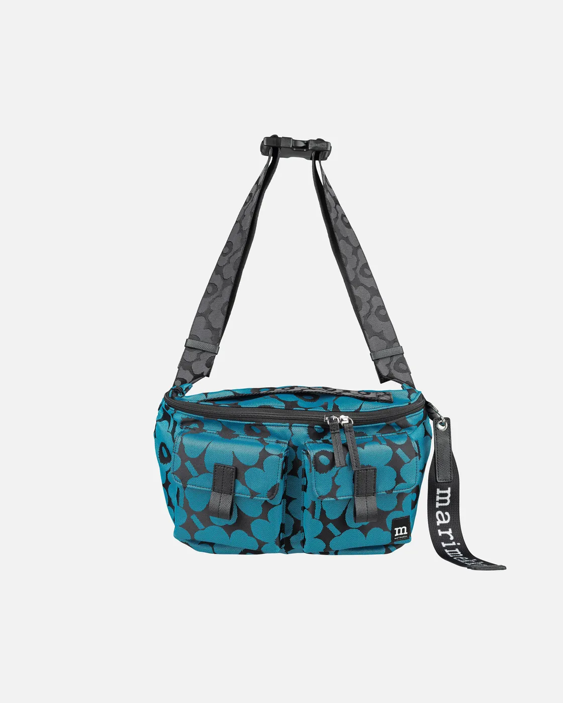 The Marimekko Sling Bag M crossbody features the jacquard knit Unikko pattern. The bag has a zipper closure, a handle, and an adjustable shoulder strap with a buckle, both with the jacquard knit Unikko pattern. There are two flap pockets in the front with magnetic closures, a zipper pocket on the inside, and a back outside pocket that closes with a magnetic button. The Marimekko keychain is attached to the front.
