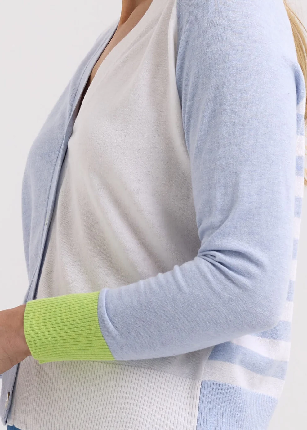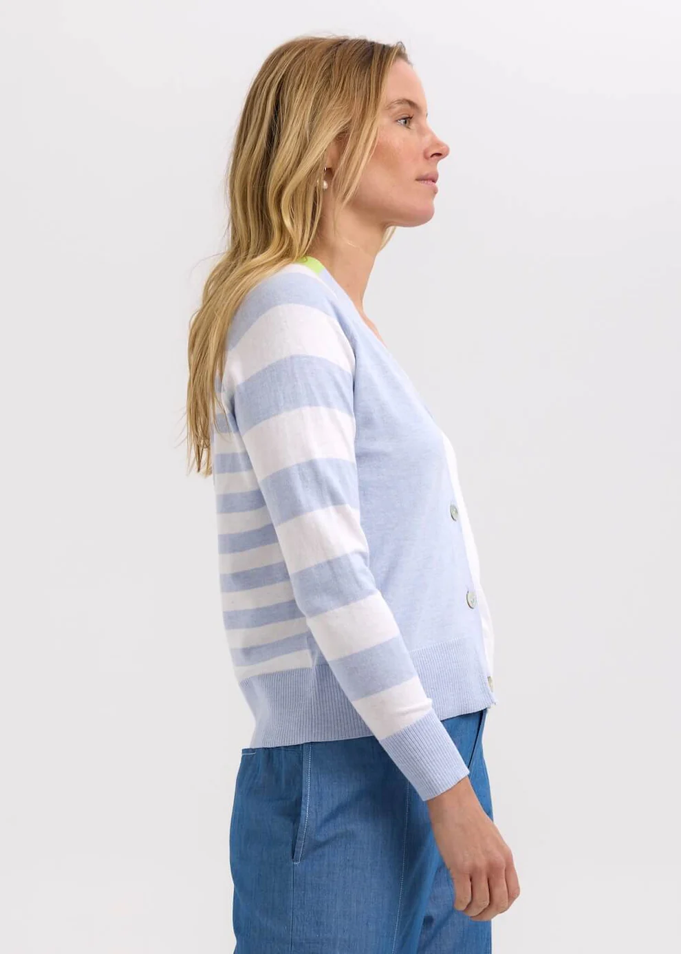 Soft, breathable, and lightweight thanks to its cotton-silk blend, this cardigan is ideal for layering year-round. The flattering V neckline and button-up front make it effortlessly wearable, while the semi-fitted cut offers structure without sacrificing comfort.