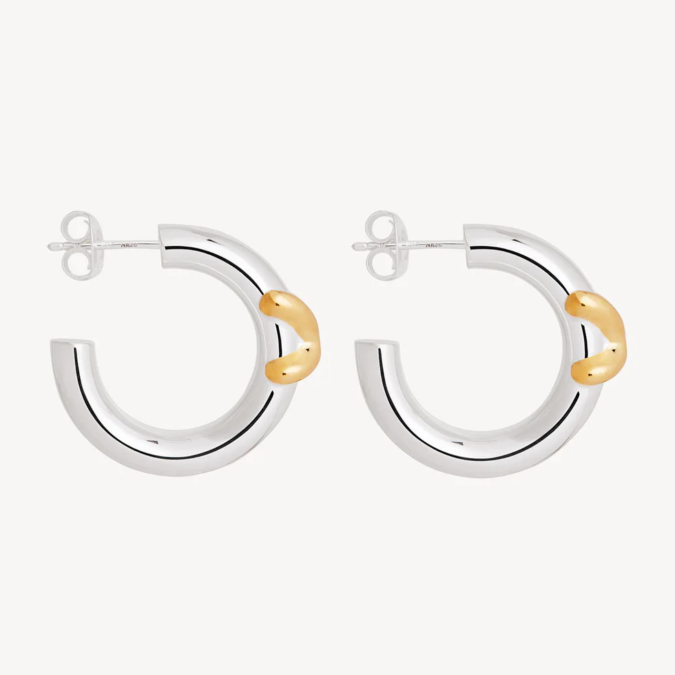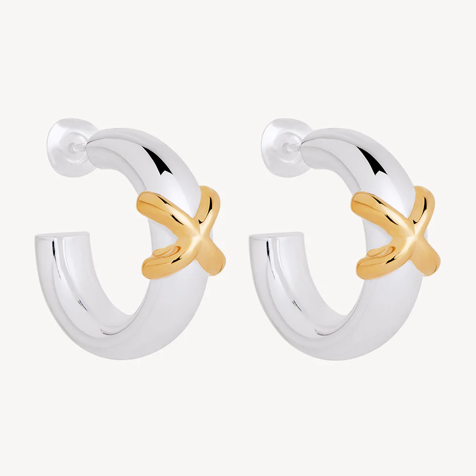 The sculptural NAJO Tendresse earrings immortalise the universal icon for a kiss with a beautiful encircling hug. Their sterling silver oval hoops feature a raised yellow gold plated ‘X,’ creating a stunning two-tone look. Affectionate and playful, these understated hoops are gorgeous for gifting or to wear as a reminder of someone you want to wrap your arms around with love.