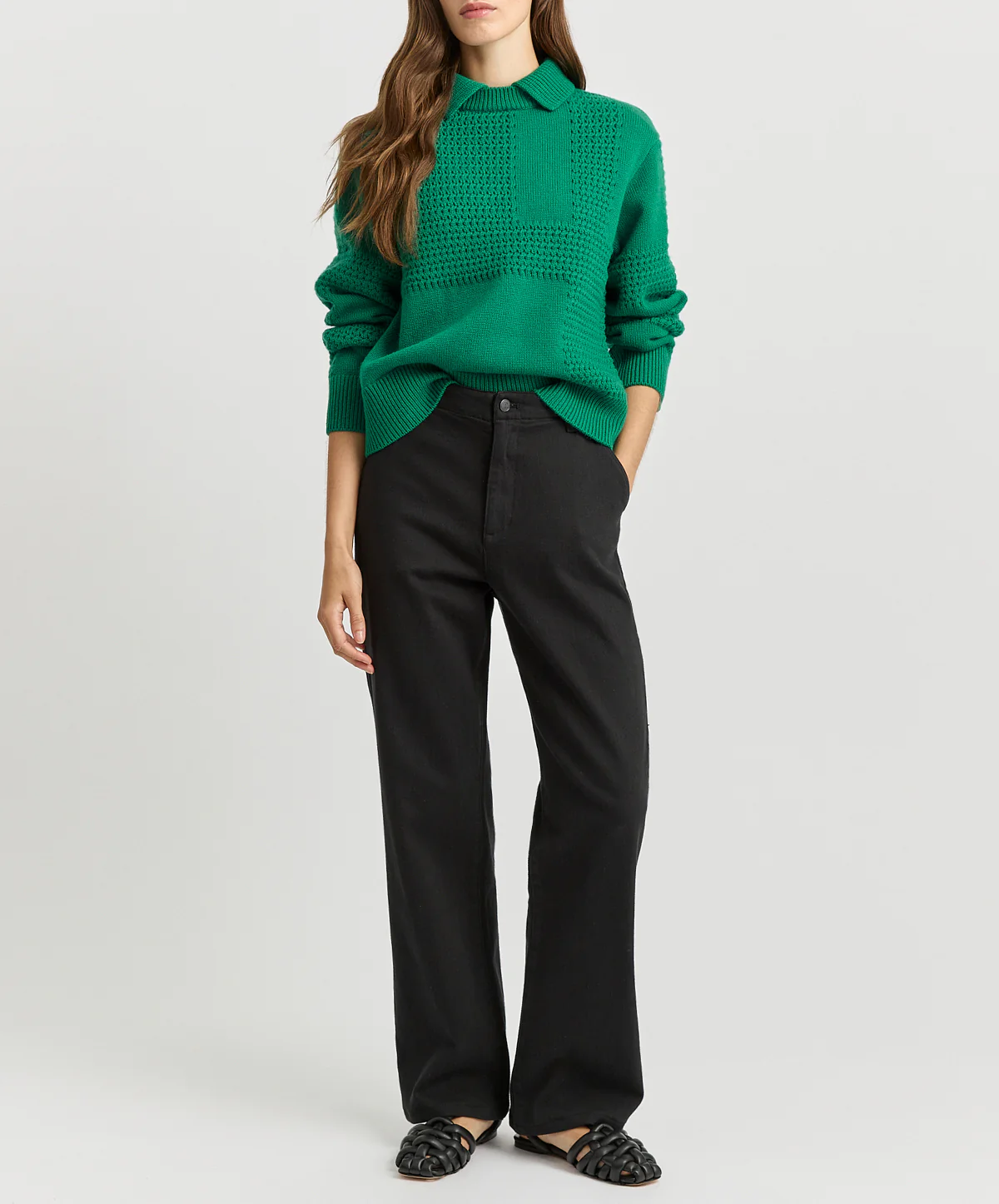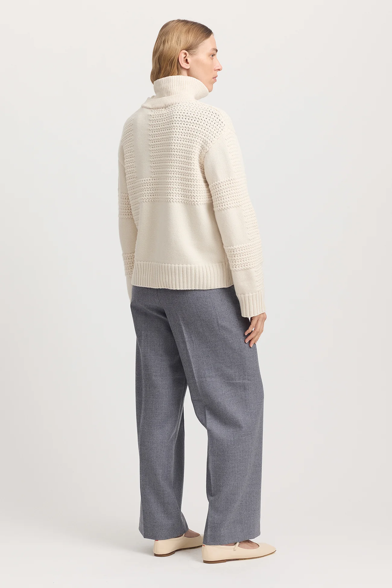 A showcase of contemporary craftsmanship, the Toorallie Textured Stitch Funnel wool knit blends racking stitch with single jersey to create a subtle patchwork effect and rich textural depth.