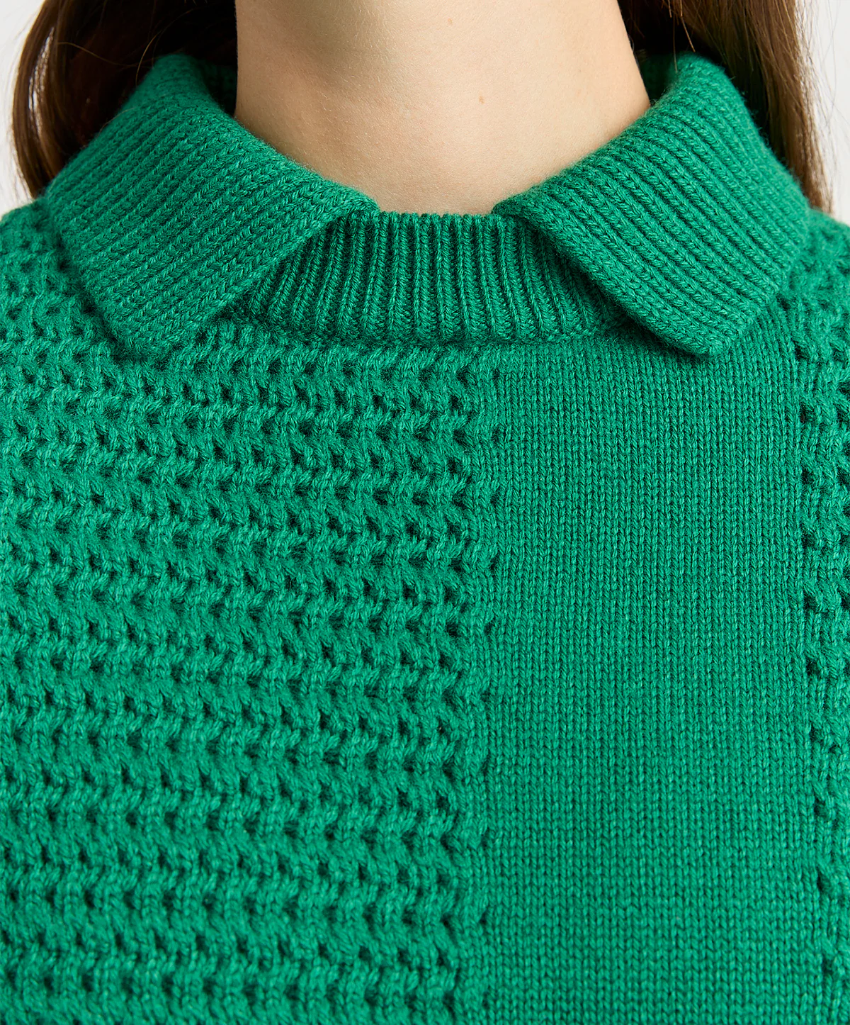 The versatile neckline—featuring a crew base and classic collar—can be worn folded for a polo-inspired feel or stood up as a soft funnel neck. Ribbed finishes at the cuffs, hem and neckline add structure to its relaxed silhouette.