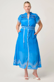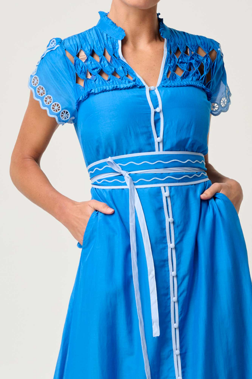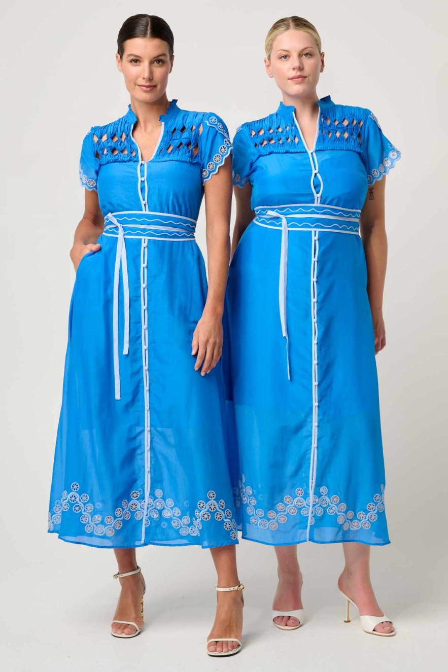 The dress features a beautifully detailed diamond smock yoke, adding texture and handcrafted elegance. The delicate embroidered motifs along the sleeves and hemline highlight its refined design, while the button-through front offers versatile styling. The self-tie belt cinches the waist for a flattering, feminine silhouette.